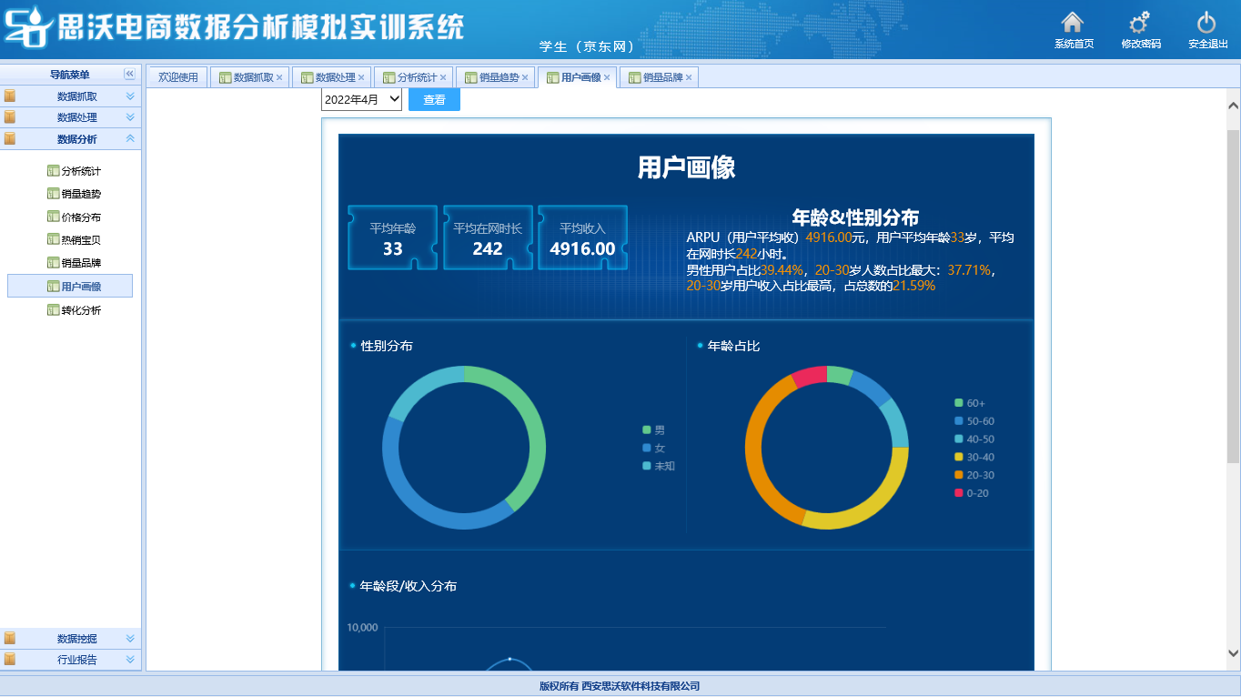 當前大(da)數(shu)據(ju)(ju)和(he)(he)(he)數(shu)據(ju)(ju)化(hua)運(yun)(yun)營(ying)的(de)(de)(de)(de)概念早已深入人(ren)心(xin),數(shu)據(ju)(ju)分(fen)(fen)析(xi)已經成(cheng)為(wei)(wei)電商(shang)(shang)(shang)從業人(ren)員(yuan)不可(ke)或缺(que)的(de)(de)(de)(de)一項(xiang)技能(neng)。《思(si)沃電商(shang)(shang)(shang)數(shu)據(ju)(ju)分(fen)(fen)析(xi)模(mo)擬(ni)(ni)實(shi)訓系(xi)統》就(jiu)(jiu)是根(gen)據(ju)(ju)當前電子商(shang)(shang)(shang)務(wu)(wu)行(xing)業發(fa)展,通過真實(shi)模(mo)擬(ni)(ni)電商(shang)(shang)(shang)運(yun)(yun)營(ying)平(ping)臺環境,幫助學生(sheng)掌握電商(shang)(shang)(shang)數(shu)據(ju)(ju)分(fen)(fen)析(xi)技能(neng)的(de)(de)(de)(de)教(jiao)學平(ping)臺軟件(jian)。隨(sui)著市(shi)場規(gui)模(mo)的(de)(de)(de)(de)普遍增(zeng)(zeng)加和(he)(he)(he)業務(wu)(wu)規(gui)模(mo)的(de)(de)(de)(de)快(kuai)速增(zeng)(zeng)長,電商(shang)(shang)(shang)業務(wu)(wu)流程開始變得復(fu)雜, 涉及(ji)的(de)(de)(de)(de)交易數(shu)據(ju)(ju)量將(jiang)繼續增(zeng)(zeng)加。為(wei)(wei)了在激(ji)烈(lie)的(de)(de)(de)(de)市(shi)場競(jing)(jing)爭(zheng)中脫(tuo)穎而出,許多電商(shang)(shang)(shang)公司都(dou)會(hui)設立(li)專門的(de)(de)(de)(de)崗位和(he)(he)(he)人(ren)員(yuan),及(ji)時了解(jie)廣(guang)告(gao)、產品(pin)(pin)價格和(he)(he)(he)銷售數(shu)據(ju)(ju),并(bing)(bing)根(gen)據(ju)(ju)競(jing)(jing)爭(zheng)產品(pin)(pin) 的(de)(de)(de)(de)產品(pin)(pin)和(he)(he)(he)營(ying)銷策略進行(xing)調整。隨(sui)著電商(shang)(shang)(shang)領域(yu)穩步增(zeng)(zeng)長,競(jing)(jing)爭(zheng)日益激(ji)烈(lie),渠道(dao)精細化(hua)運(yun)(yun)營(ying)已然(ran)成(cheng)為(wei)(wei)品(pin)(pin)牌突(tu)圍的(de)(de)(de)(de)重(zhong)中之重(zhong)。 數(shu)據(ju)(ju)(和(he)(he)(he)數(shu)據(ju)(ju)分(fen)(fen)析(xi))對(dui)(dui)電商(shang)(shang)(shang)至關重(zhong)要,通過海量數(shu)據(ju)(ju),店(dian)鋪運(yun)(yun)營(ying)人(ren)員(yuan)可(ke)以了解(jie)客戶的(de)(de)(de)(de)行(xing)為(wei)(wei)和(he)(he)(he)偏好(hao),也可(ke)以洞察同行(xing)業競(jing)(jing)爭(zheng)對(dui)(dui)手的(de)(de)(de)(de)方(fang)向和(he)(he)(he)動態,這就(jiu)(jiu)是了解(jie)自己、了解(jie)競(jing)(jing)爭(zheng)對(dui)(dui)手。 《思(si)沃電商(shang)(shang)(shang)數(shu)據(ju)(ju)分(fen)(fen)析(xi)模(mo)擬(ni)(ni)實(shi)訓系(xi)統》高度模(mo)擬(ni)(ni)京(jing)東網,真實(shi)獲(huo)取海量京(jing)東真實(shi)數(shu)據(ju)(ju),該教(jiao)學軟件(jian)系(xi)統的(de)(de)(de)(de)從京(jing)東的(de)(de)(de)(de)各行(xing)業數(shu)據(ju)(ju)分(fen)(fen)析(xi)入手,系(xi)統展示在電子商(shang)(shang)(shang)務(wu)(wu)環境下進行(xing)運(yun)(yun)營(ying)數(shu)據(ju)(ju)分(fen)(fen)析(xi)的(de)(de)(de)(de)各種思(si)路和(he)(he)(he)方(fang)法。 能(neng)讓(rang)學生(sheng)快(kuai)速學會(hui)如何做電商(shang)(shang)(shang)數(shu)據(ju)(ju)分(fen)(fen)析(xi),并(bing)(bing)能(neng)利用數(shu)據(ju)(ju)分(fen)(fen)析(xi)結果(guo)指導網店(dian)經營(ying)。