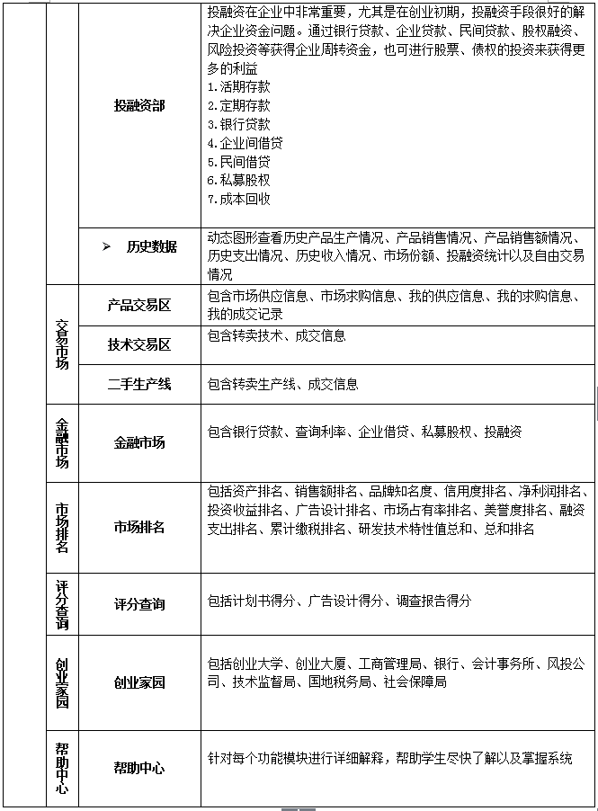4、企(qi)(qi)業投融(rong)資(zi)管理:系統必須含有投融(rong)資(zi)模(mo)塊,了解(jie)操作企(qi)(qi)業的基本(ben)投資(zi)和(he)融(rong)資(zi)手段,模(mo)塊包(bao)括:銀(yin)行(xing)存款(kuan)(kuan)、銀(yin)行(xing)貸款(kuan)(kuan)、企(qi)(qi)業間(jian)借貸、民間(jian)借貸、私(si)幕股(gu)權(quan)。另外還含有風險投資(zi)模(mo)塊,在審核計劃(hua)書后做出評(ping)價和(he)評(ping)分,由(you)教(jiao)師設(she)置是(shi)否給予風險投資(zi),以及(ji)金額。設(she)置后系統自動給相應企(qi)(qi)業發送反饋信息,接受并給予風投的企(qi)(qi)業前來簽訂風投協議領取風投資(zi)金