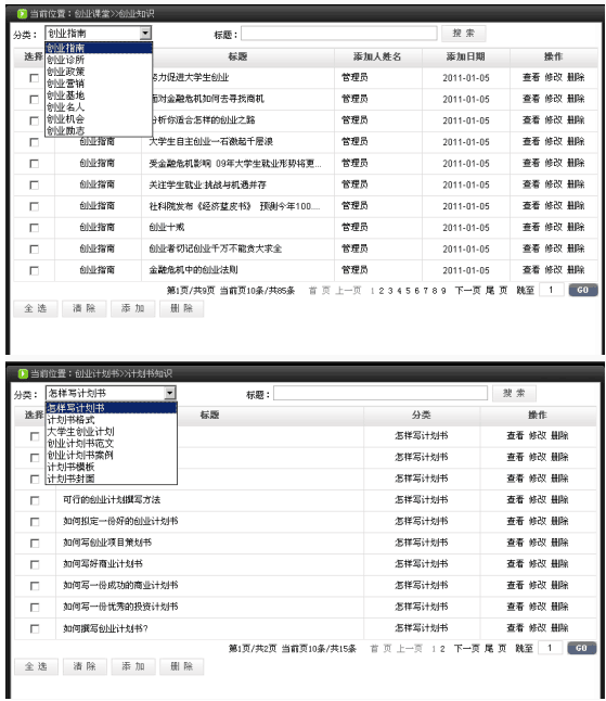2、包(bao)含創(chuang)(chuang)(chuang)(chuang)(chuang)業(ye)(ye)(ye)(ye)(ye)理論知識的學(xue)習(xi)和創(chuang)(chuang)(chuang)(chuang)(chuang)業(ye)(ye)(ye)(ye)(ye)實戰(zhan)訓(xun)練。創(chuang)(chuang)(chuang)(chuang)(chuang)業(ye)(ye)(ye)(ye)(ye)理論知識包(bao)括測評系(xi)統、創(chuang)(chuang)(chuang)(chuang)(chuang)業(ye)(ye)(ye)(ye)(ye)課(ke)堂、創(chuang)(chuang)(chuang)(chuang)(chuang)業(ye)(ye)(ye)(ye)(ye)講(jiang)談、創(chuang)(chuang)(chuang)(chuang)(chuang)業(ye)(ye)(ye)(ye)(ye)命題、創(chuang)(chuang)(chuang)(chuang)(chuang)業(ye)(ye)(ye)(ye)(ye)計劃書、法(fa)規知識、網上創(chuang)(chuang)(chuang)(chuang)(chuang)業(ye)(ye)(ye)(ye)(ye)、創(chuang)(chuang)(chuang)(chuang)(chuang)業(ye)(ye)(ye)(ye)(ye)準備、創(chuang)(chuang)(chuang)(chuang)(chuang)業(ye)(ye)(ye)(ye)(ye)論壇(tan)。創(chuang)(chuang)(chuang)(chuang)(chuang)業(ye)(ye)(ye)(ye)(ye)實戰(zhan)訓(xun)練包(bao)含選擇行業(ye)(ye)(ye)(ye)(ye)、注冊(ce)公司、人員招聘、產(chan)品戰(zhan)略策劃、產(chan)品生產(chan)、渠道銷售、促銷、備貨運送等內容(rong)。