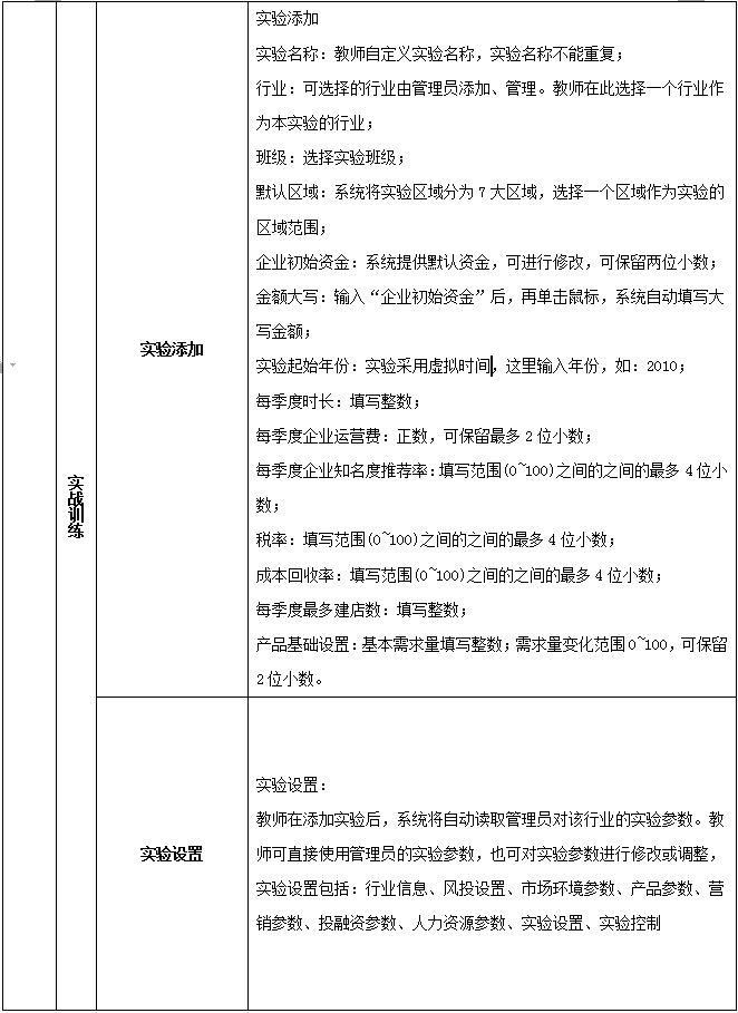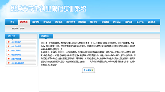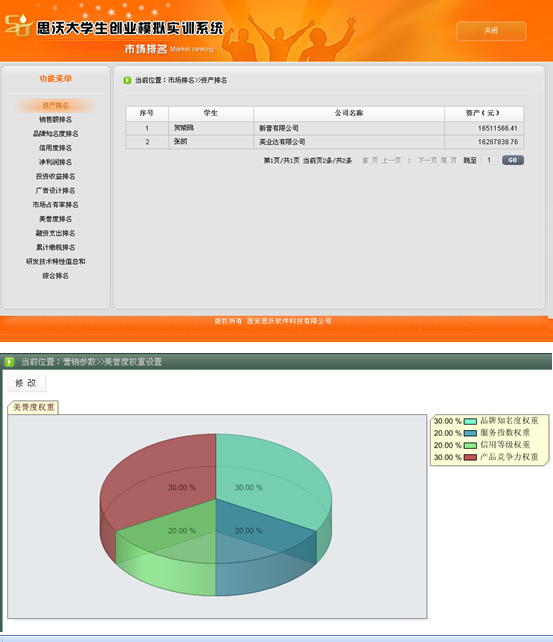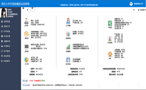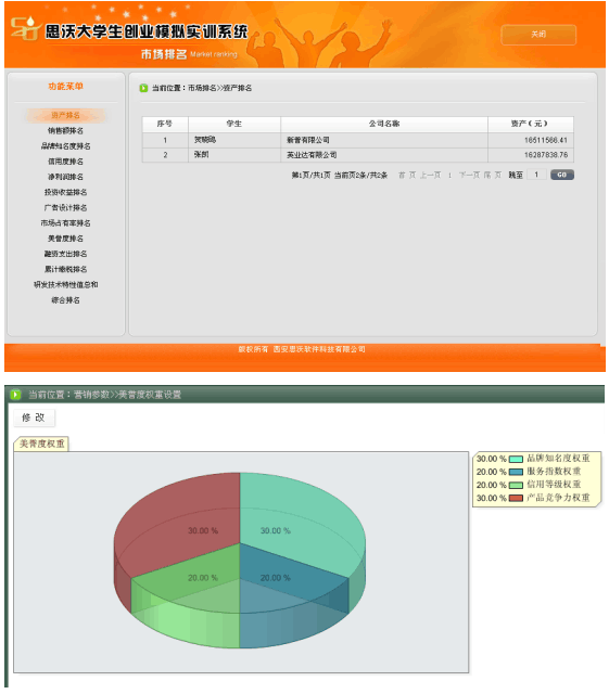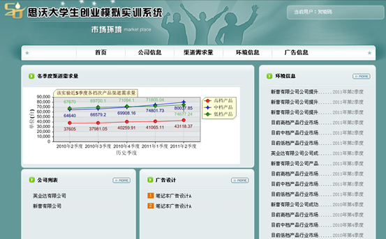 思沃大(da)(da)學(xue)(xue)生(sheng)創(chuang)(chuang)(chuang)(chuang)(chuang)業(ye)(ye)(ye)模(mo)擬(ni)(ni)實(shi)(shi)(shi)訓平臺(tai)系(xi)(xi)統從大(da)(da)學(xue)(xue)生(sheng)創(chuang)(chuang)(chuang)(chuang)(chuang)業(ye)(ye)(ye)的(de)(de)(de)現(xian)狀分(fen)析(xi),將創(chuang)(chuang)(chuang)(chuang)(chuang)業(ye)(ye)(ye)教育(yu)的(de)(de)(de)內(nei)容以及因素滲(shen)透在專業(ye)(ye)(ye)實(shi)(shi)(shi)踐教學(xue)(xue)中(zhong),并根(gen)據創(chuang)(chuang)(chuang)(chuang)(chuang)業(ye)(ye)(ye)教育(yu)的(de)(de)(de)目標及內(nei)容設置較完善的(de)(de)(de)創(chuang)(chuang)(chuang)(chuang)(chuang)業(ye)(ye)(ye)實(shi)(shi)(shi)踐體(ti)系(xi)(xi)。軟件模(mo)擬(ni)(ni)交互(hu)思想,采用(yong)國際先(xian)進(jin)的(de)(de)(de)計算(suan)機仿真(zhen)技(ji)術,仿真(zhen)模(mo)擬(ni)(ni)虛擬(ni)(ni)市(shi)場環境、市(shi)場調查以及整(zheng)個(ge)(ge)市(shi)場競爭結構(gou)。學(xue)(xue)生(sheng)通過(guo)軟件學(xue)(xue)習(xi)創(chuang)(chuang)(chuang)(chuang)(chuang)業(ye)(ye)(ye)心理學(xue)(xue)、創(chuang)(chuang)(chuang)(chuang)(chuang)業(ye)(ye)(ye)講(jiang)堂、網上創(chuang)(chuang)(chuang)(chuang)(chuang)業(ye)(ye)(ye)、創(chuang)(chuang)(chuang)(chuang)(chuang)業(ye)(ye)(ye)準備等創(chuang)(chuang)(chuang)(chuang)(chuang)業(ye)(ye)(ye)知識,撰寫一份創(chuang)(chuang)(chuang)(chuang)(chuang)業(ye)(ye)(ye)計劃書,投入到創(chuang)(chuang)(chuang)(chuang)(chuang)業(ye)(ye)(ye)實(shi)(shi)(shi)戰中(zhong)。創(chuang)(chuang)(chuang)(chuang)(chuang)業(ye)(ye)(ye)實(shi)(shi)(shi)戰分(fen)為公司(si)注(zhu)(zhu)冊和實(shi)(shi)(shi)戰運營(ying)。公司(si)注(zhu)(zhu)冊采用(yong)Flash動畫模(mo)式(shi),模(mo)擬(ni)(ni)公司(si)注(zhu)(zhu)冊的(de)(de)(de)整(zheng)個(ge)(ge)流程(cheng)。實(shi)(shi)(shi)戰運營(ying)是整(zheng)個(ge)(ge)系(xi)(xi)統的(de)(de)(de)主(zhu)體(ti),將全(quan)國分(fen)為七個(ge)(ge)區(qu)(qu)(qu)(qu)域:東(dong)北地(di)區(qu)(qu)(qu)(qu)、華(hua)北地(di)區(qu)(qu)(qu)(qu)、西北地(di)區(qu)(qu)(qu)(qu)、華(hua)東(dong)地(di)區(qu)(qu)(qu)(qu)、西南(nan)地(di)區(qu)(qu)(qu)(qu)、華(hua)中(zhong)地(di)區(qu)(qu)(qu)(qu)、華(hua)南(nan)地(di)區(qu)(qu)(qu)(qu)。系(xi)(xi)統模(mo)擬(ni)(ni)公司(si)內(nei)部與(yu)(yu)外在市(shi)場之間的(de)(de)(de)矛盾(dun),創(chuang)(chuang)(chuang)(chuang)(chuang)業(ye)(ye)(ye)者(zhe)通過(guo)各種調查、決(jue)策解決(jue)企業(ye)(ye)(ye)市(shi)場運營(ying)過(guo)程(cheng)中(zhong)可能(neng)遇到的(de)(de)(de)各種情況。在區(qu)(qu)(qu)(qu)域需(xu)求(qiu)飽和后擴大(da)(da)市(shi)場,對其中(zhong)出(chu)現(xian)的(de)(de)(de)問題和運營(ying)結果進(jin)行分(fen)析(xi)與(yu)(yu)評估,培(pei)養大(da)(da)學(xue)(xue)生(sheng)正確(que)的(de)(de)(de)人生(sheng)觀(guan)、價值觀(guan)、就業(ye)(ye)(ye)觀(guan),提高大(da)(da)學(xue)(xue)生(sheng)勇于創(chuang)(chuang)(chuang)(chuang)(chuang)業(ye)(ye)(ye)的(de)(de)(de)精神,讓大(da)(da)學(xue)(xue)生(sheng)有(you)良(liang)好(hao)的(de)(de)(de)創(chuang)(chuang)(chuang)(chuang)(chuang)業(ye)(ye)(ye)意識,增強大(da)(da)學(xue)(xue)生(sheng)自(zi)主(zhu)創(chuang)(chuang)(chuang)(chuang)(chuang)業(ye)(ye)(ye)能(neng)力。